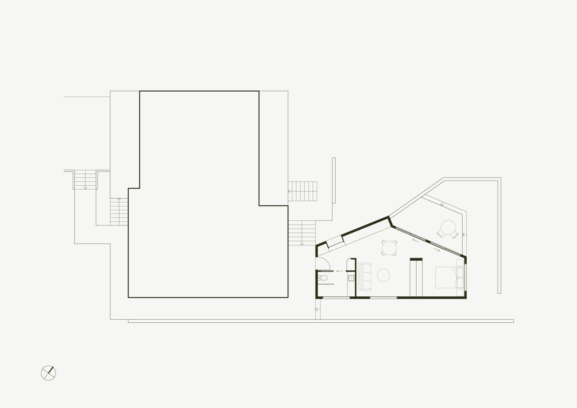 Tucked behind a 1960s home, this discreet studio facilitates ageing in place, allowing its owners to stay put in their much-loved suburb. Its design and siting establish privacy and allow the existing home to be occupied by others. The broadening layout creates the illusion of generous spaces, while walls of joinery design plentiful storage into the architecture, defining different areas within this compact studio.