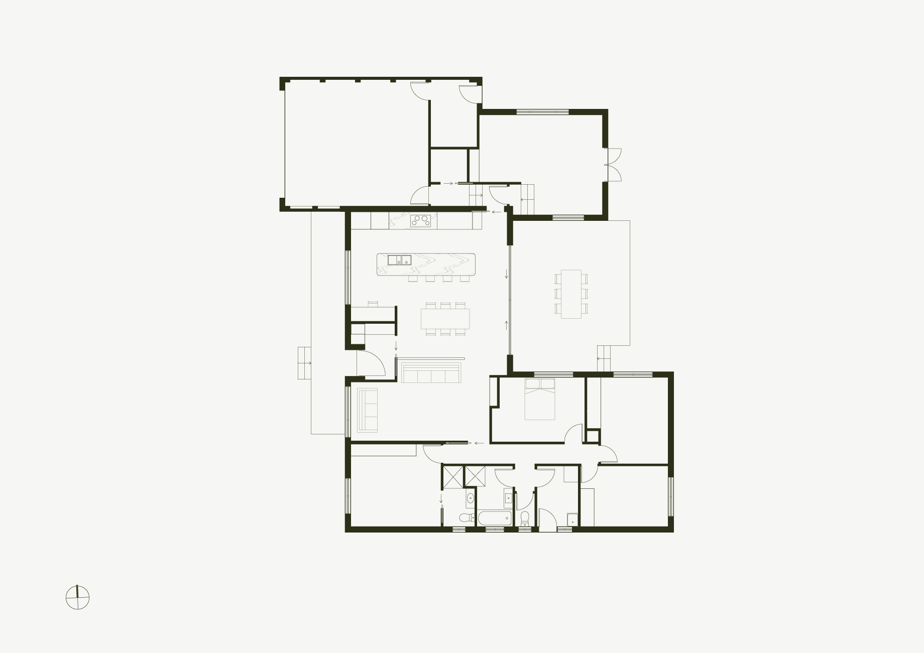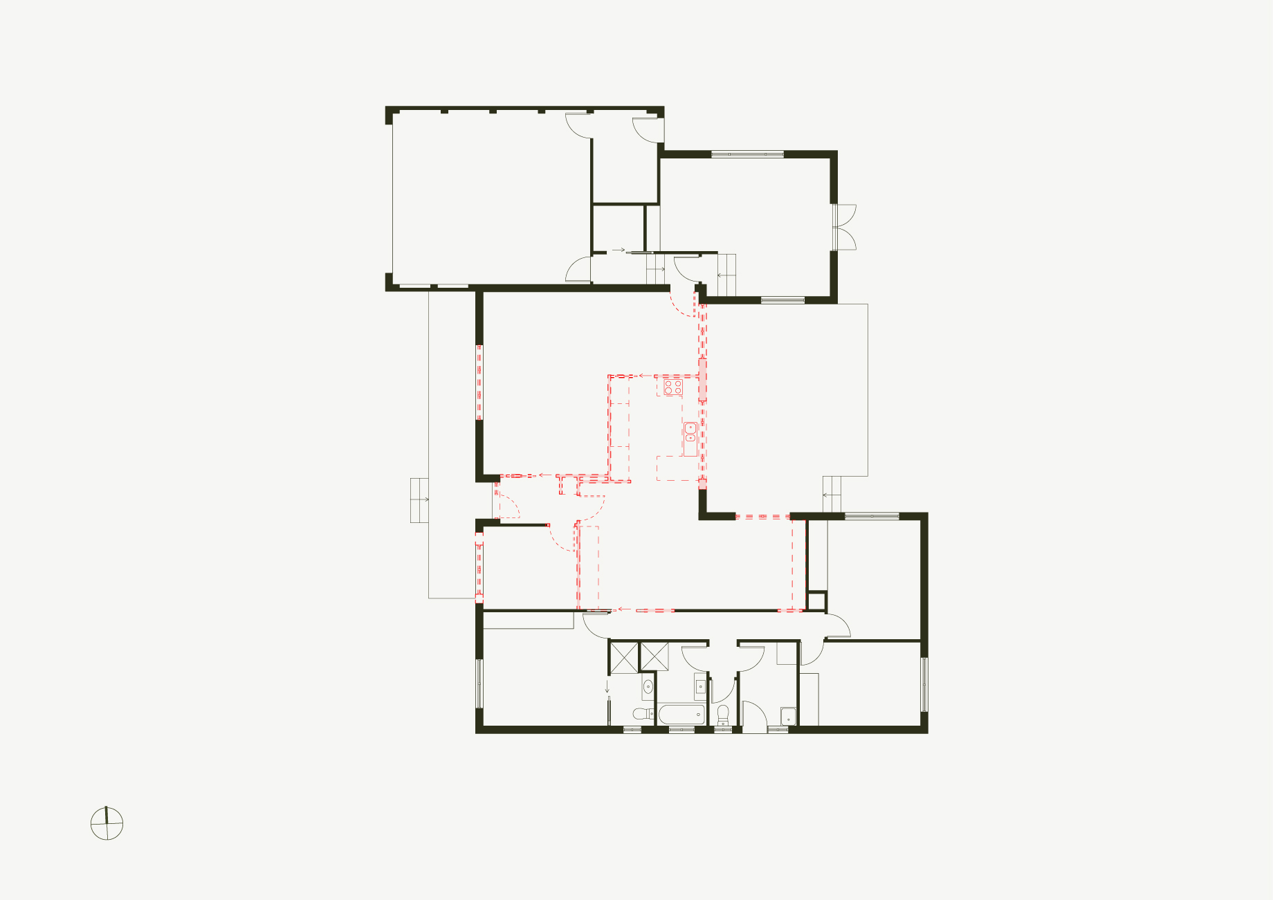 The material palette combines colour, timber, stone and brass, enlivening new areas with contemporary architectural finishes. Full-height joinery and shafted skylights counter the challenging orientation and existing low ceilings to usher both morning and afternoon light into altered areas.